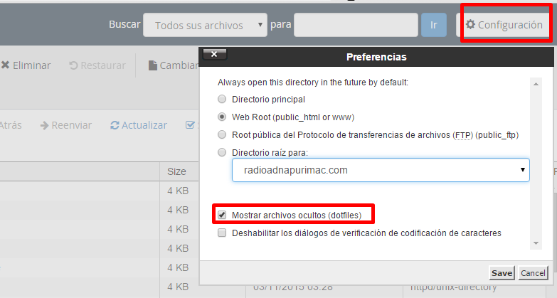 2.- Ahora vamos por el otro método casi 100% efectivo, para ello lo primero que vamos hacer es acceder a nuestro cpanel de nuestro hosting y se van a Administrador de Archivos, dentro de su panel se ubican en la carpeta de su dominio, ahí en la entrada principal hay varios archivos incluido htaccess, por si no aparece el archivo .htacces es porque esta oculto a simple vista o no existe, en mi caso me voy a la parte superior de mi cpanel donde dice Configuración luego desplegamos y nos aparecerá un cuadro de dialogo con la opción que permita hacer check donde dice "mostrar archivos ocultos (doffiles)" y lo guardamos.